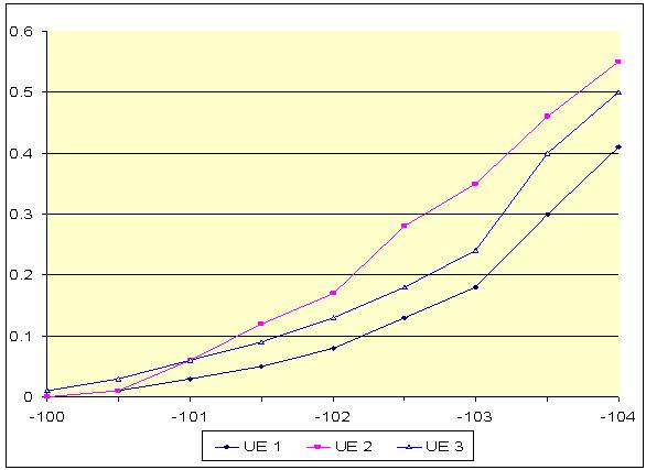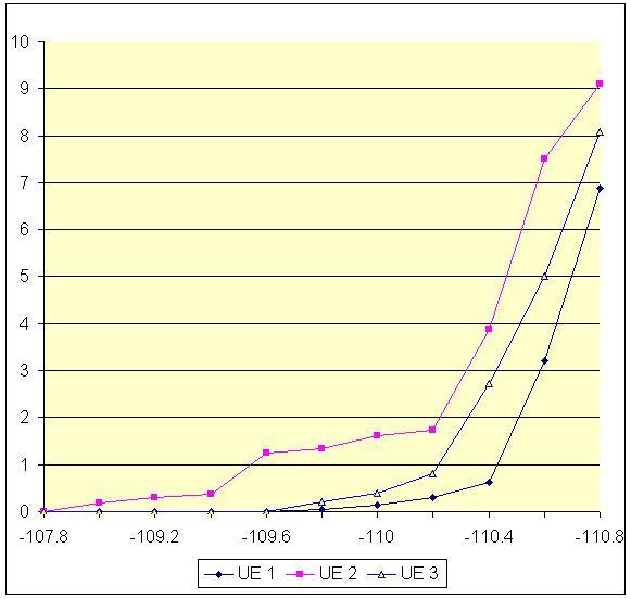 测量结果: 在测试装置中也已实现提议的协议。图5示出基于12.2kbps和33.6kbps RMC的典型BER测试装置。可看到对于同样0.1%的BER,当信道编码工作时,接收机的灵敏度就从-100dBm改进到-110dBm。下面我们测量三种不同品牌的UE,测试结果如图6和图7所示。可看到不同品牌UE有不同的误码性能。当去掉信道编码时(使用33.6kbps RMC),误码性能随电池功率而逐渐改进。但当信道编码工作时(使用12.2 kbps RMC),在到达临界点后BER性能就得到急剧改进。这是因为在超过临界点后,大多数错误都得到信道解码器的校正。