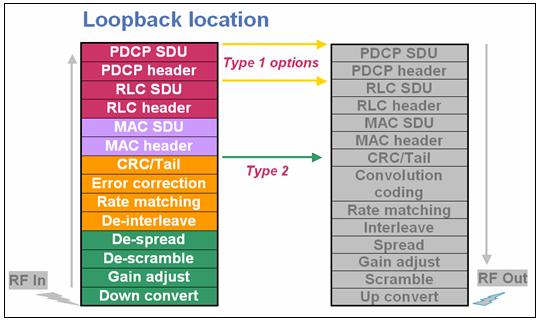 在3GPP标准中定义了二种环回结构类型,如图3所示。对于Type 1,当包数据是无线电承载时,环回位置在包数据收敛协议(PDCP)层的顶部;若使用RMC,则在无线电链路控制(RLC)层的顶部。环回Type 2用于实现块误码率(BLER)测试。测试装置首先向UE发送带有经计算CRC的传输块。在恢复可能包含错误的传输块和CRC后,UE通过上行链路把同样的传输块和CRC发回测试装置。根据接收到的传输块,测试装置计算相应CRC,并与UE发送相比较。只要两者的CRC不相等,就有块错产生。为得到这种类型BLER测试的成功,测试装置必须保证UE能设置足够大的上行链路传输块,以包括原传输块数据和CRC。Type 2环回的另一项条件是指示UE不要在上行链路上发送它的计算后的CRC,但要在下行链路上转发所接收的CRC。