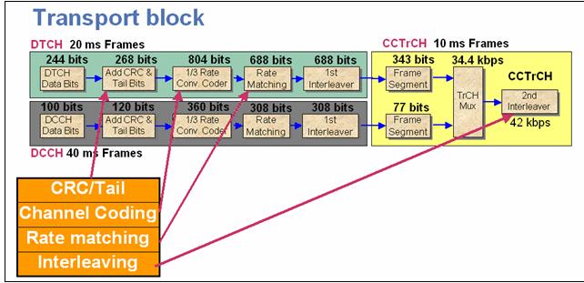 原来的12.2kbps RMC实现:图2示出专用物理数据信道(DPDCH)的结构,它由多路转换DTCH数据和专用控制信道(DCCH)构成。在每一20ms DTCH帧内产生244bit数据,使原始数据率为244bit/20ms = 12.2kbps。接着增加24个循环冗余检验(CRC)和尾比特,然后把整个数据块加至1/3率卷积编码器。再在每804bit编码数据中穿孔掉126bit,留给下一级的就只有688bit。在环回测试期间,已知测试数据码型经DTCH发送,构成12.2kbps RMC。