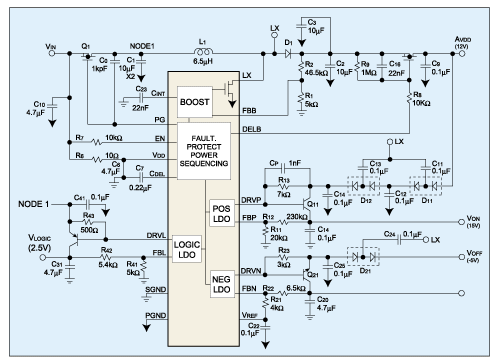 每个LCD面板显然都需要电源,面板上有4个主要的电压电源。主电源(AVDD)提供驱动LCD显示器中众多模拟IC(包括将图像内容驱动到显示器本身的列驱动器)所需的高电压。尽管很多人认为TFT-LCD是数字显示器,但每个像素的亮度实际上是由存储在像素单元中的模拟电压电平所决定的,并利用在像素之前的RGB滤波器来实现色彩再现。由于显示器的这种模拟特性,AVDD电源必须具备很好的负载调节能力,并且能提供足够的电流来对显示器中每个像素进行快速充放电。显示器内的其它电源包括数字IC所用的逻辑电源,以及为显示器中行驱动器供电的高电压Von和负电压VOFF。对于高性能视频显示器来说,使用高性能TFT-LCD调节器非常重要,它可以减少图像失真和拖尾效应。像EL7585(见图2)这样的器件在单个IC中包含所有这4个电源,另外还提供对避免损坏LCD显示器很重要的电源排序功能。
